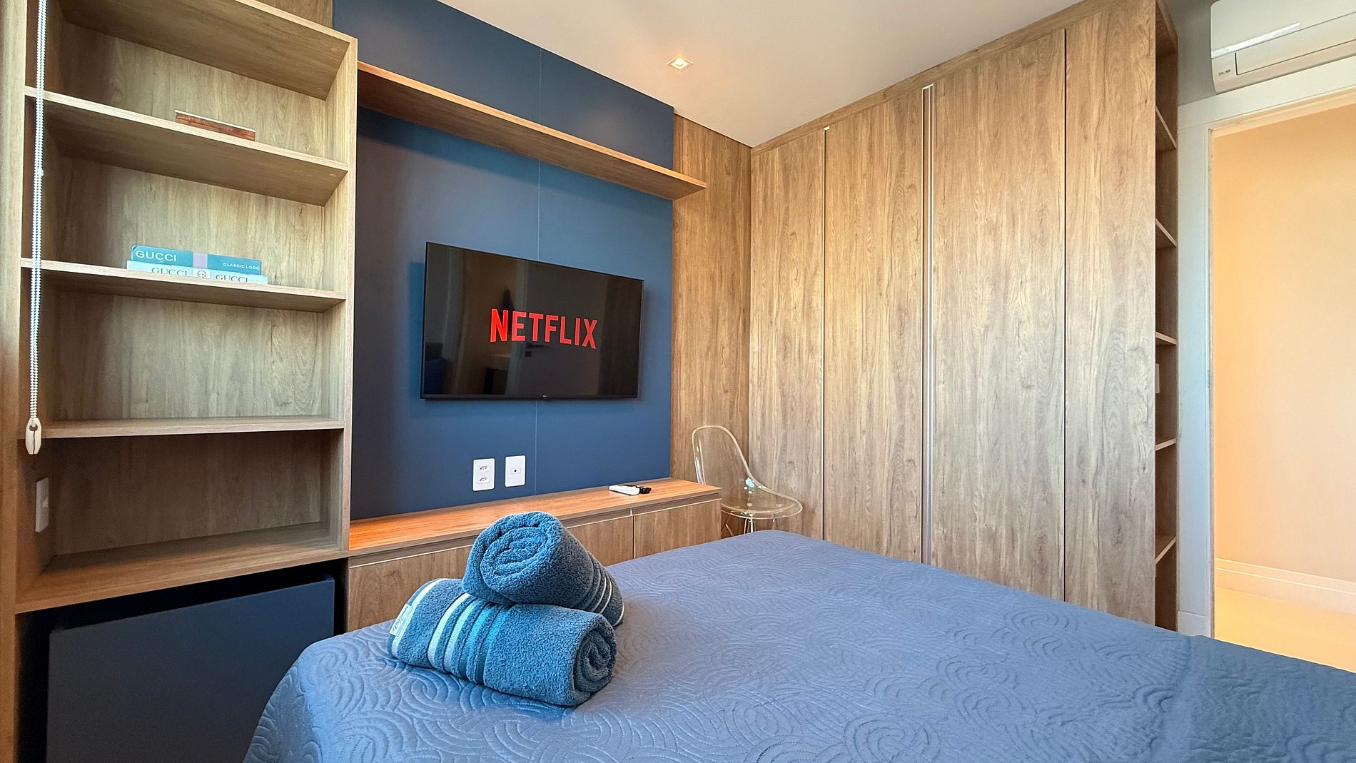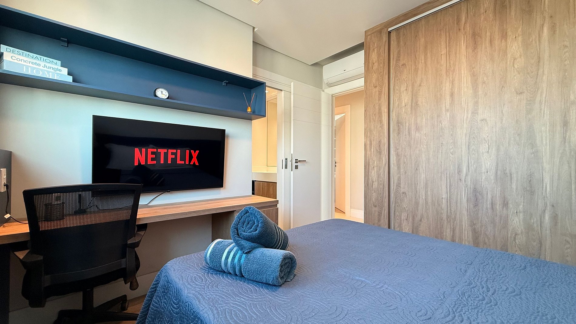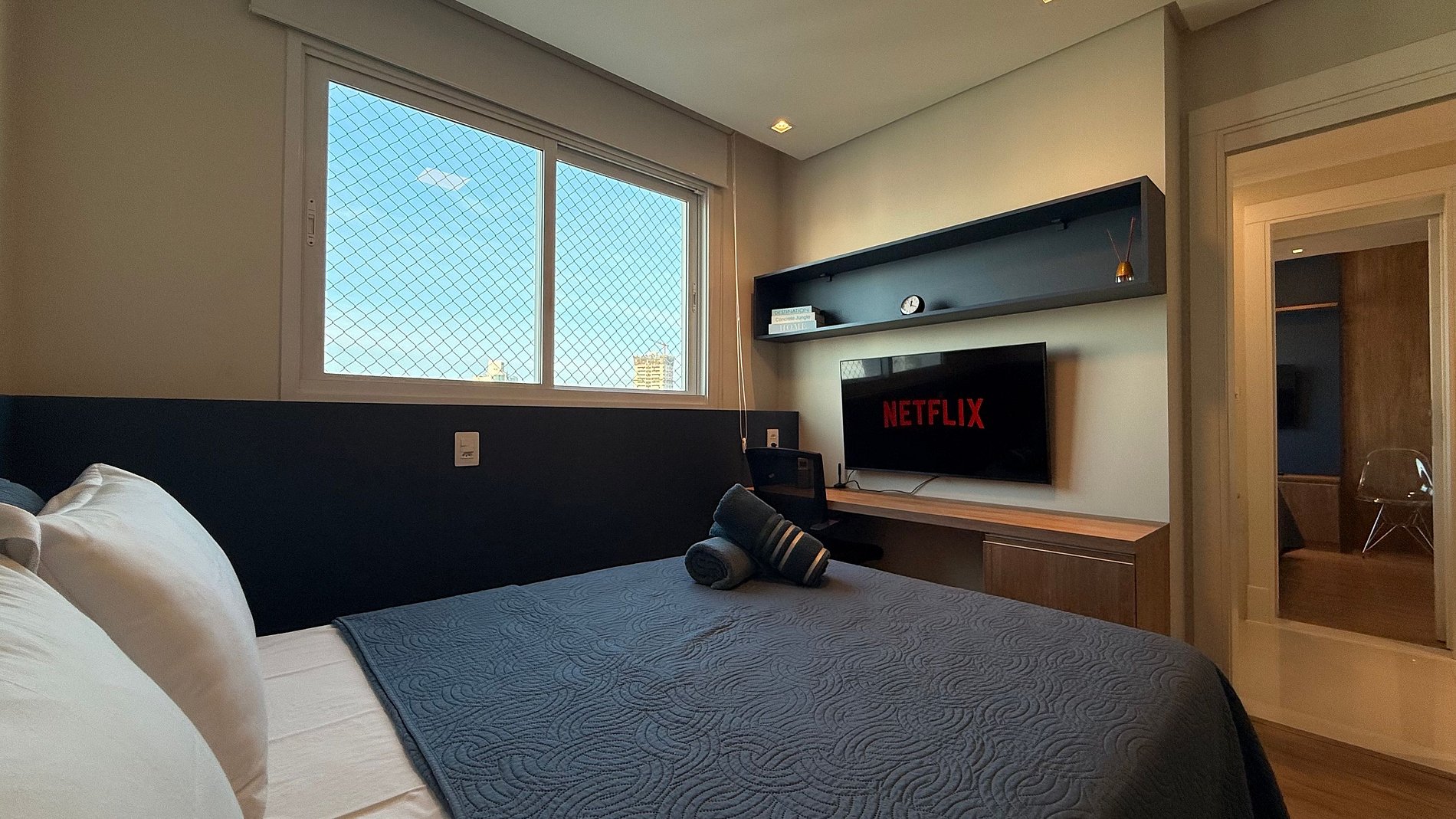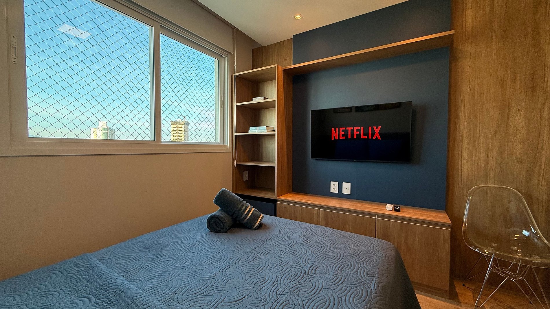 - TV de 70" polegadas com app como Netflix, Globoplay, Amazon Prime (necessário conectar com a conta própria)