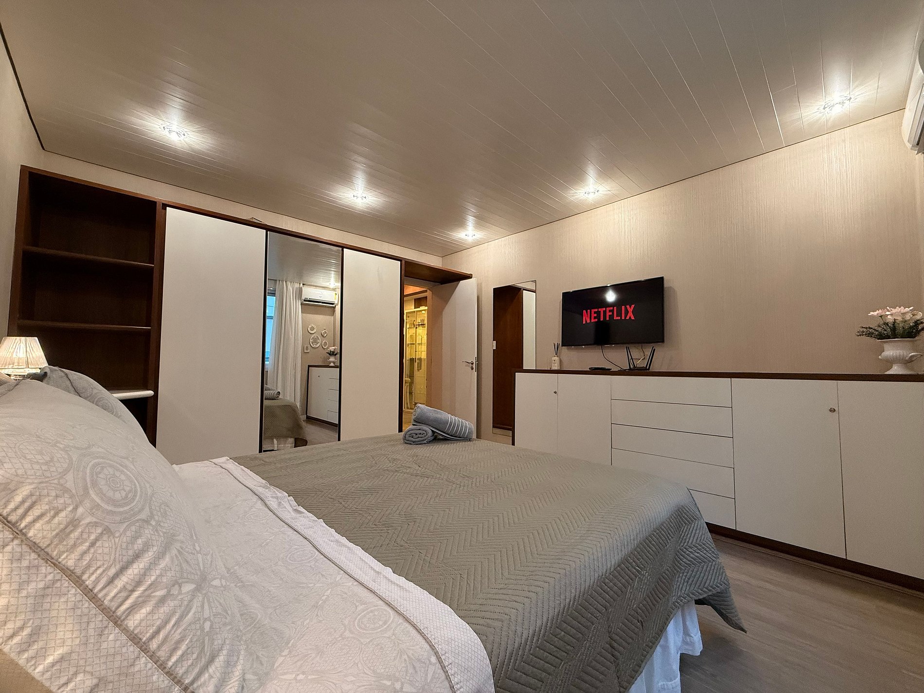- QUARTO 1: Cama de Casal Queen Size + ar condicionado split + guarda roupas grande + TV Smart (apenas aplicativos streaming, necessário conectar própria conta)