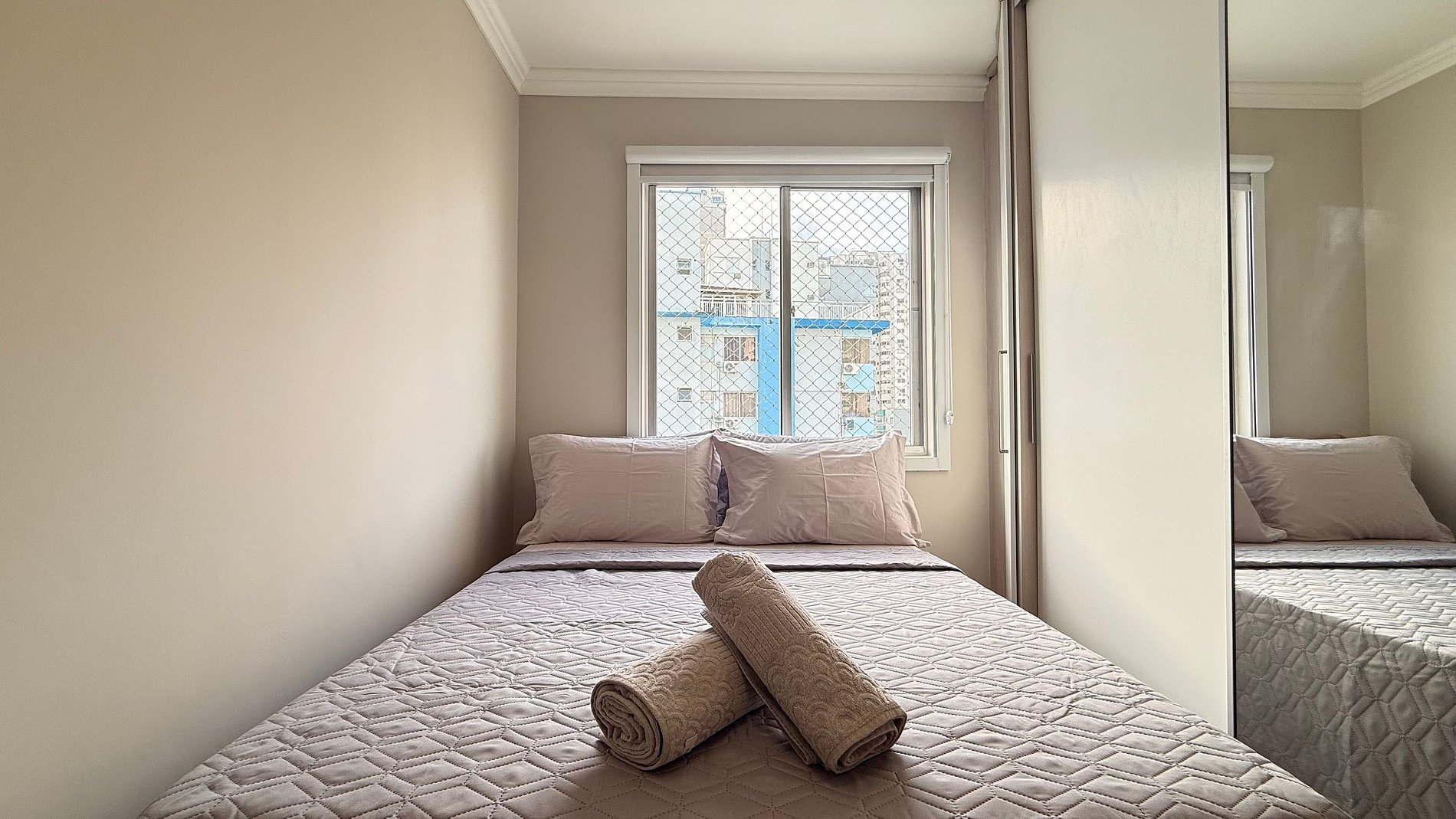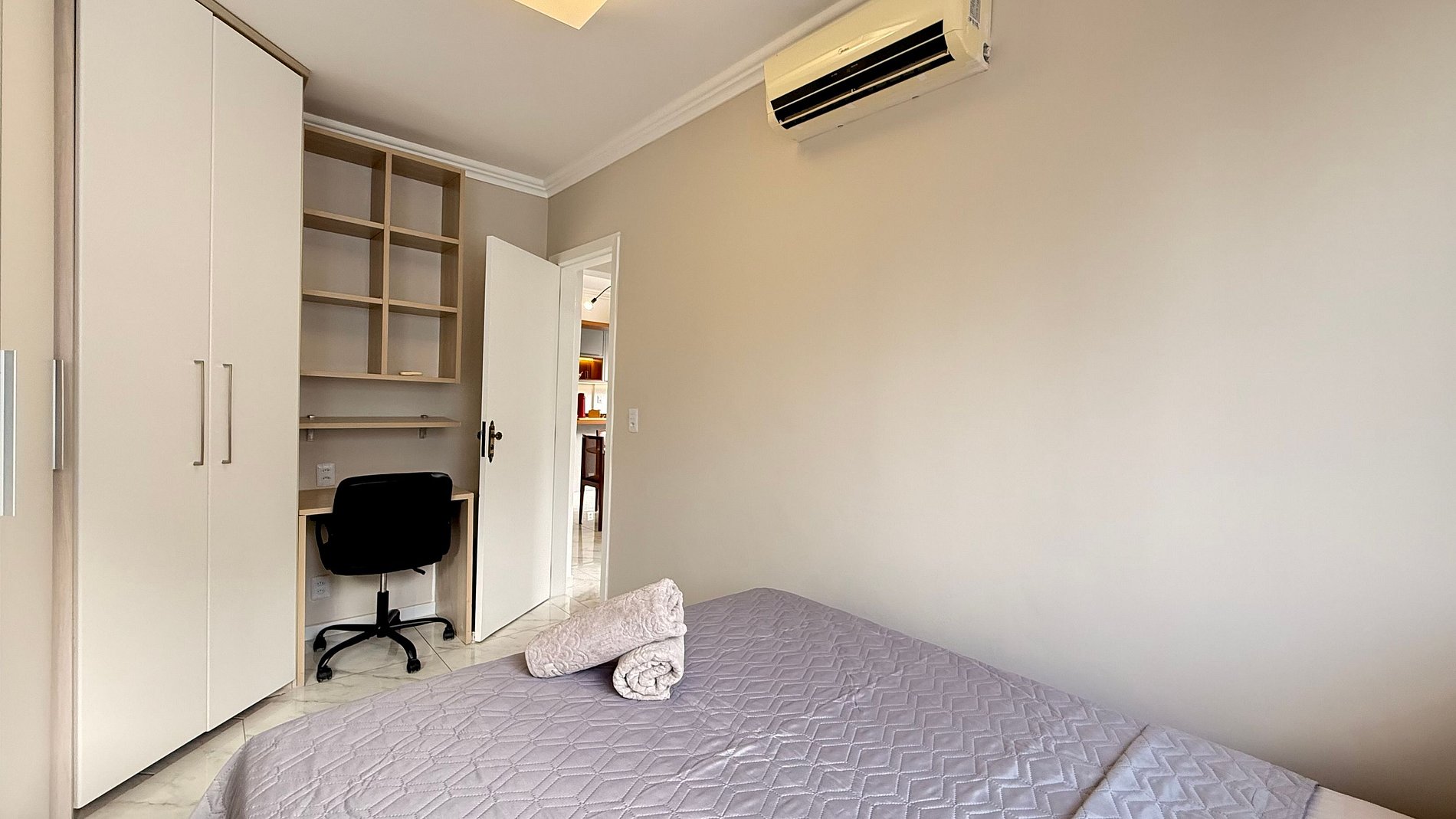 - Quarto 2: Cama box casal, guarda-roupa grande, escrivaninha para home office e cortinas 100% blackout.