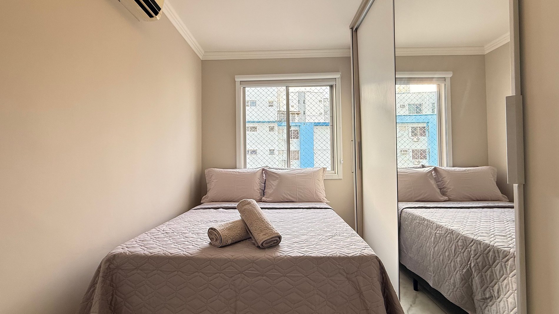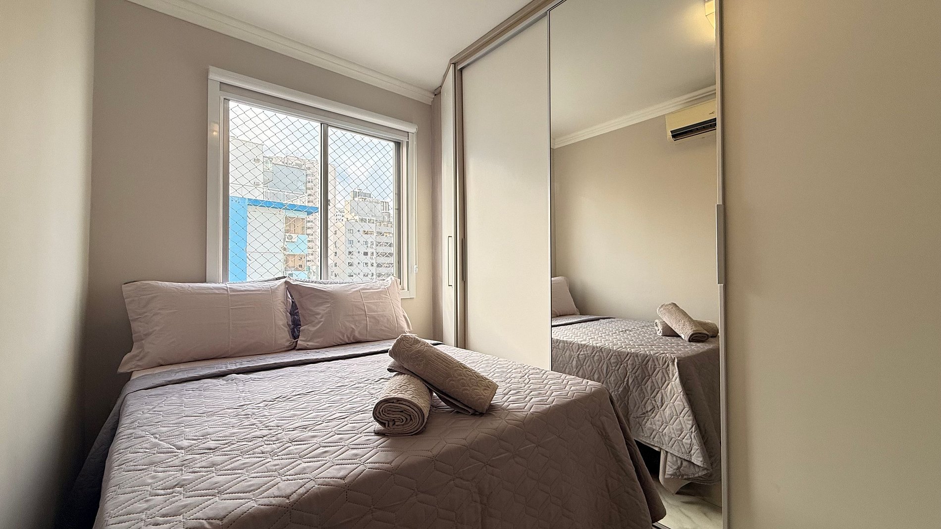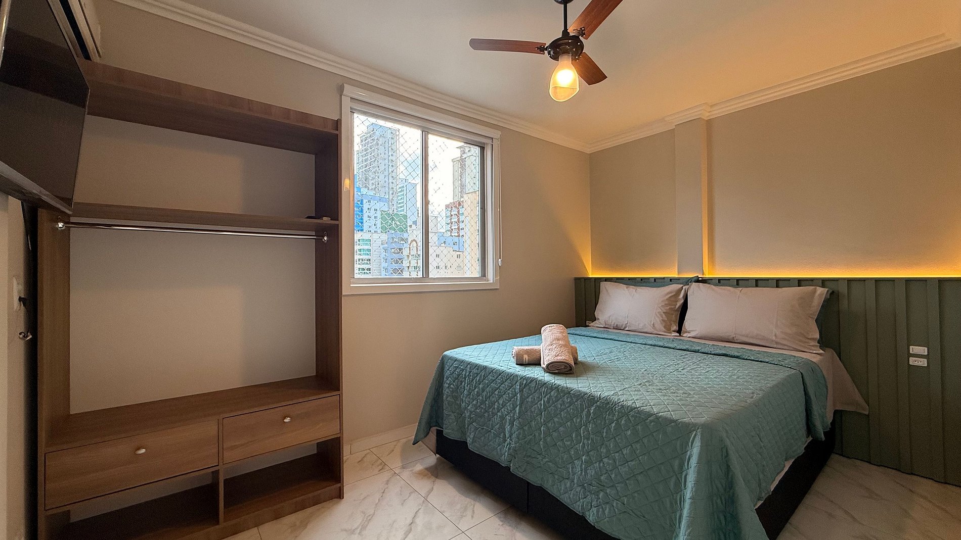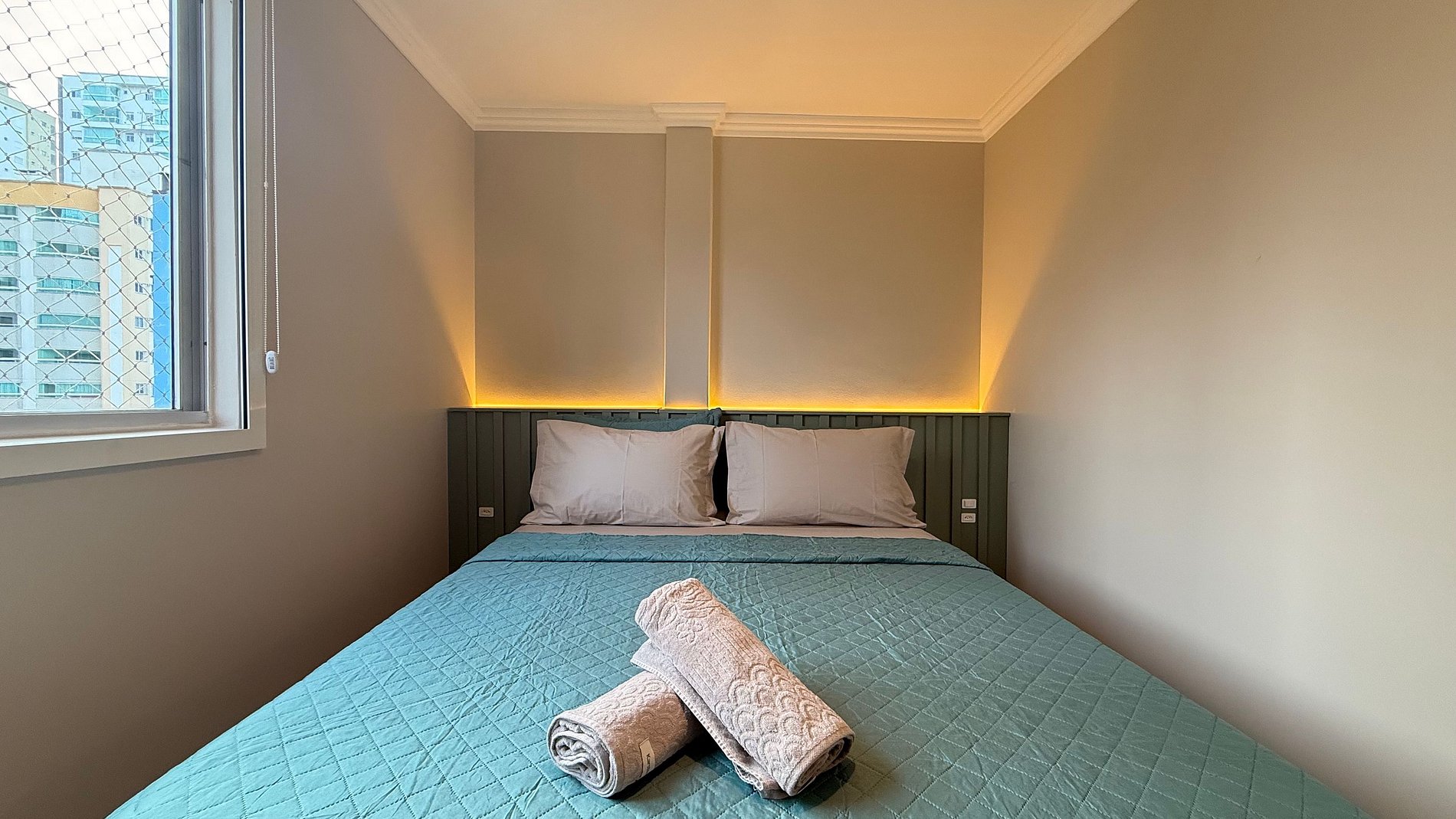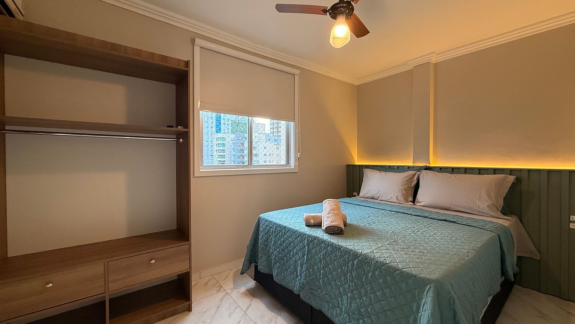 - Quarto 1: Cama box Queen Size nova, TV Smart, guarda-roupa e cortinas 100% blackout.