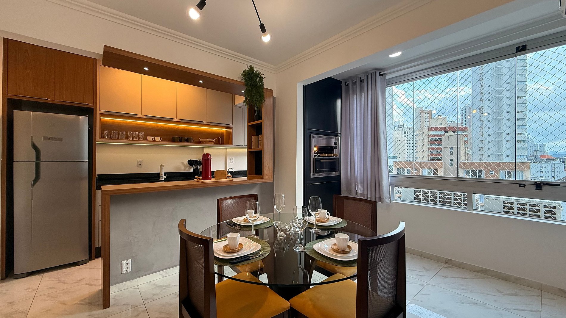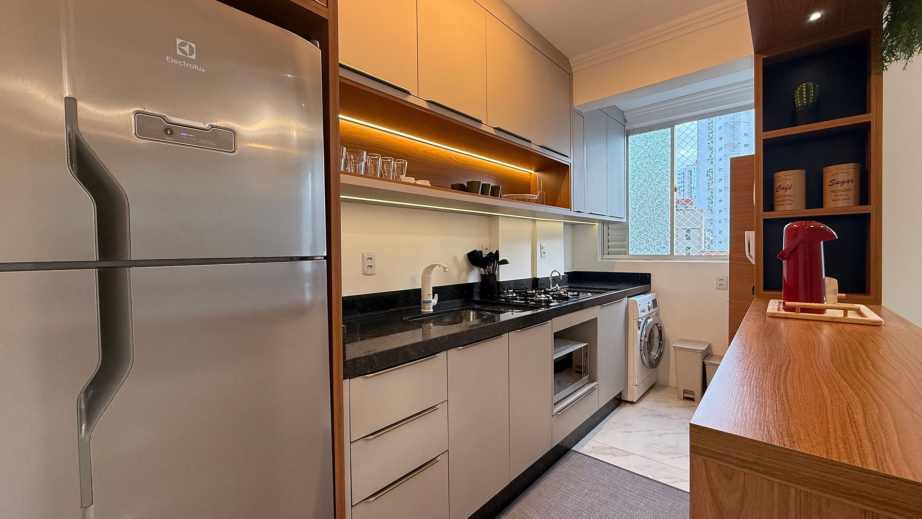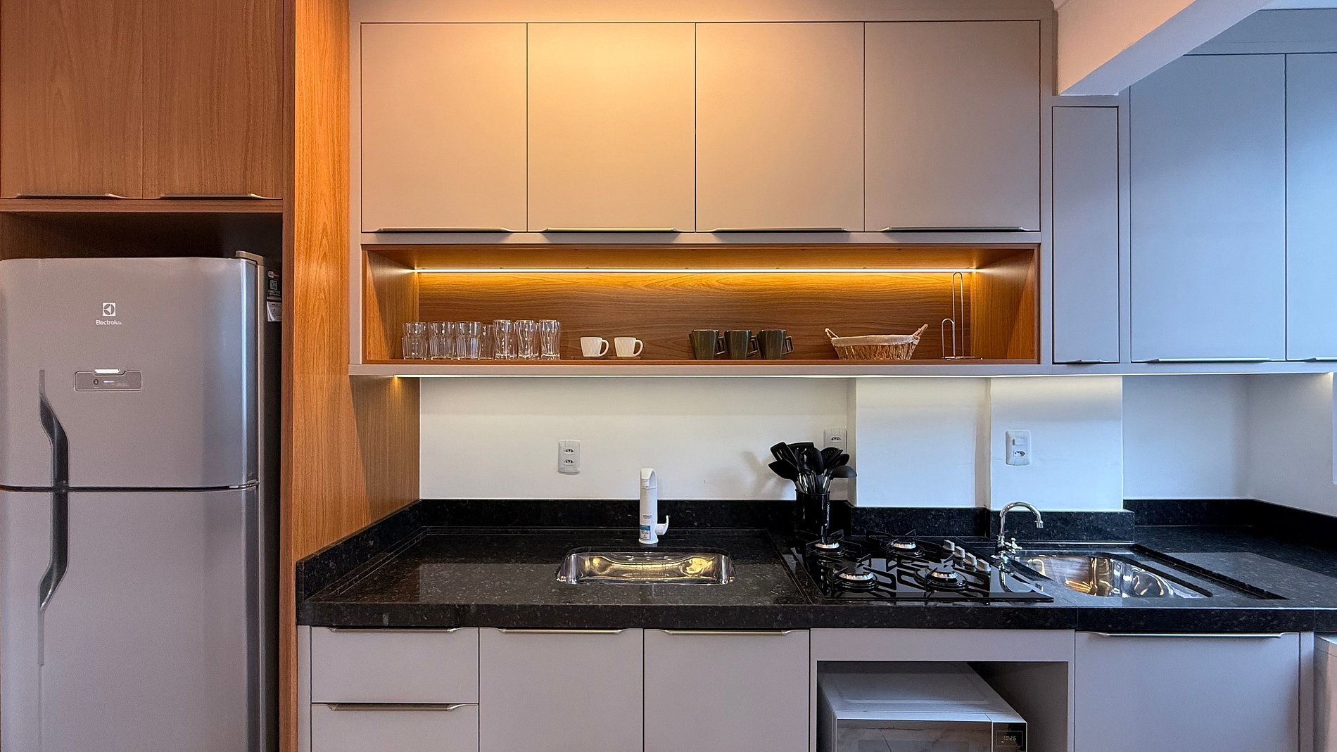 - Geladeira, cooktop, micro-ondas e filtro de água potável.