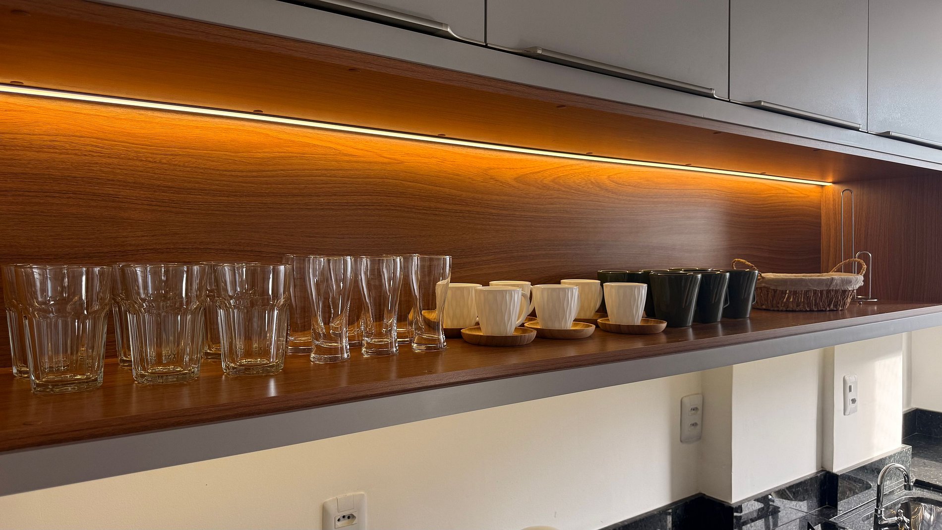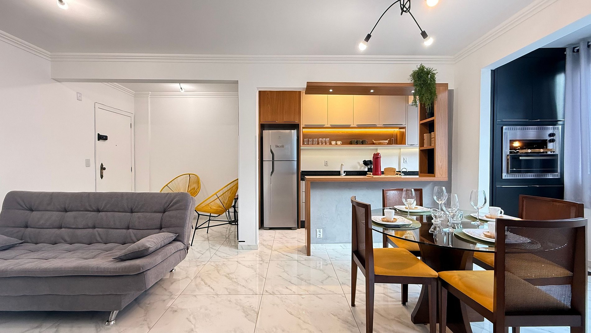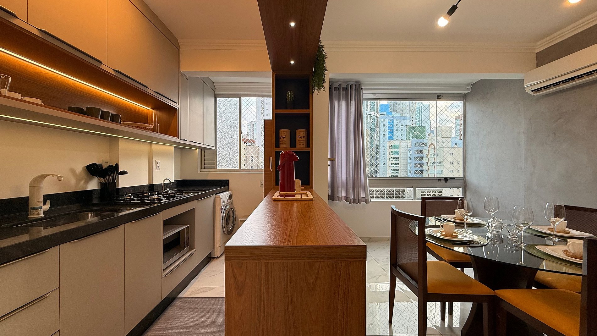 - Geladeira, cooktop, micro-ondas e filtro de água potável.