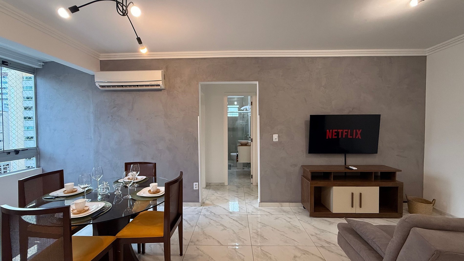 - Sala de estar com TV Smart de 50" polegadas, equipada com canais a cabo e aplicativos como Netflix, Globoplay e Amazon Prime (basta conectar sua conta).