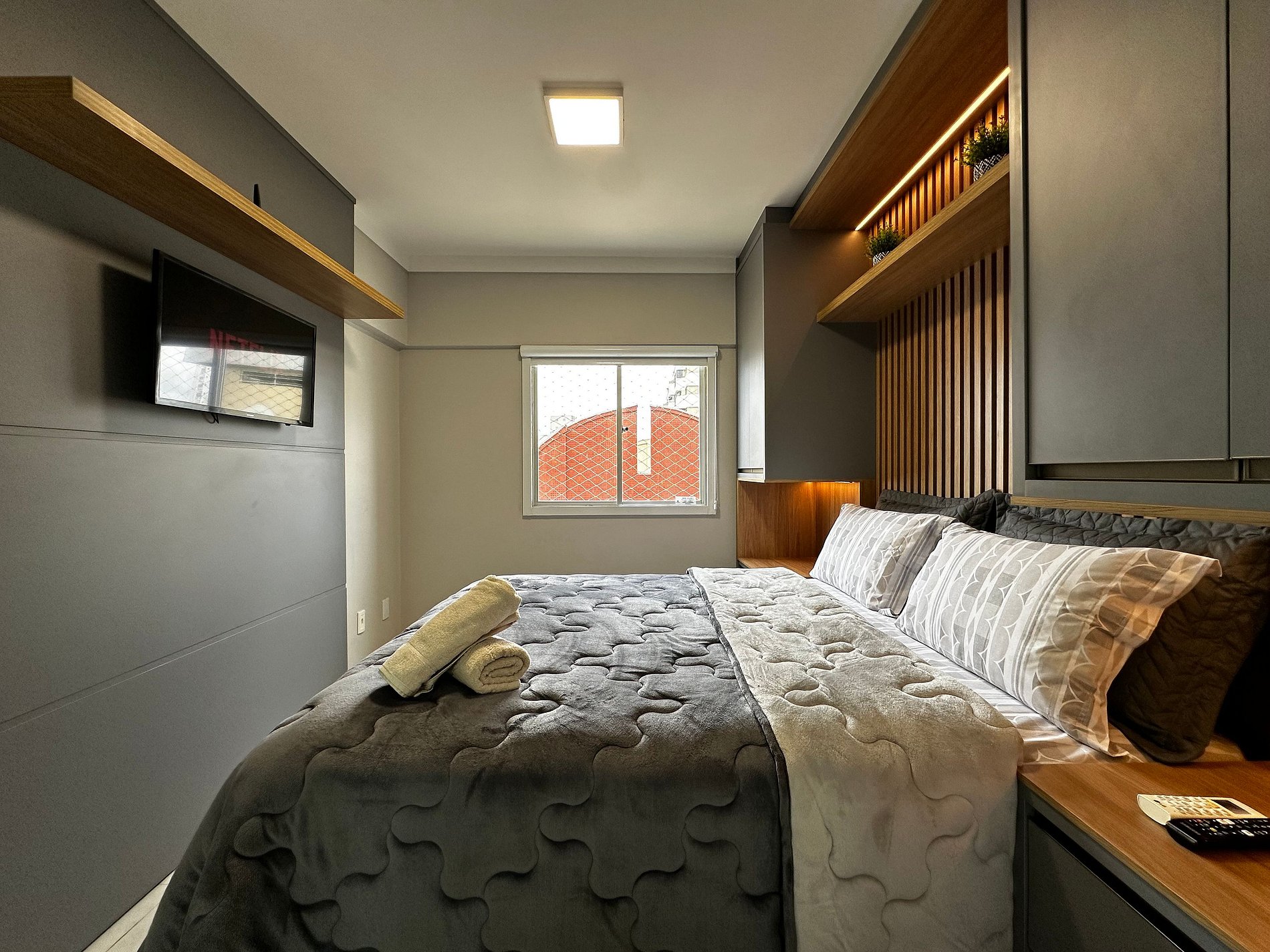 - 1º Quarto: Suíte com cama queen size nova, ar condicionado novo modelo split quente e frio, persiana box 100% off.