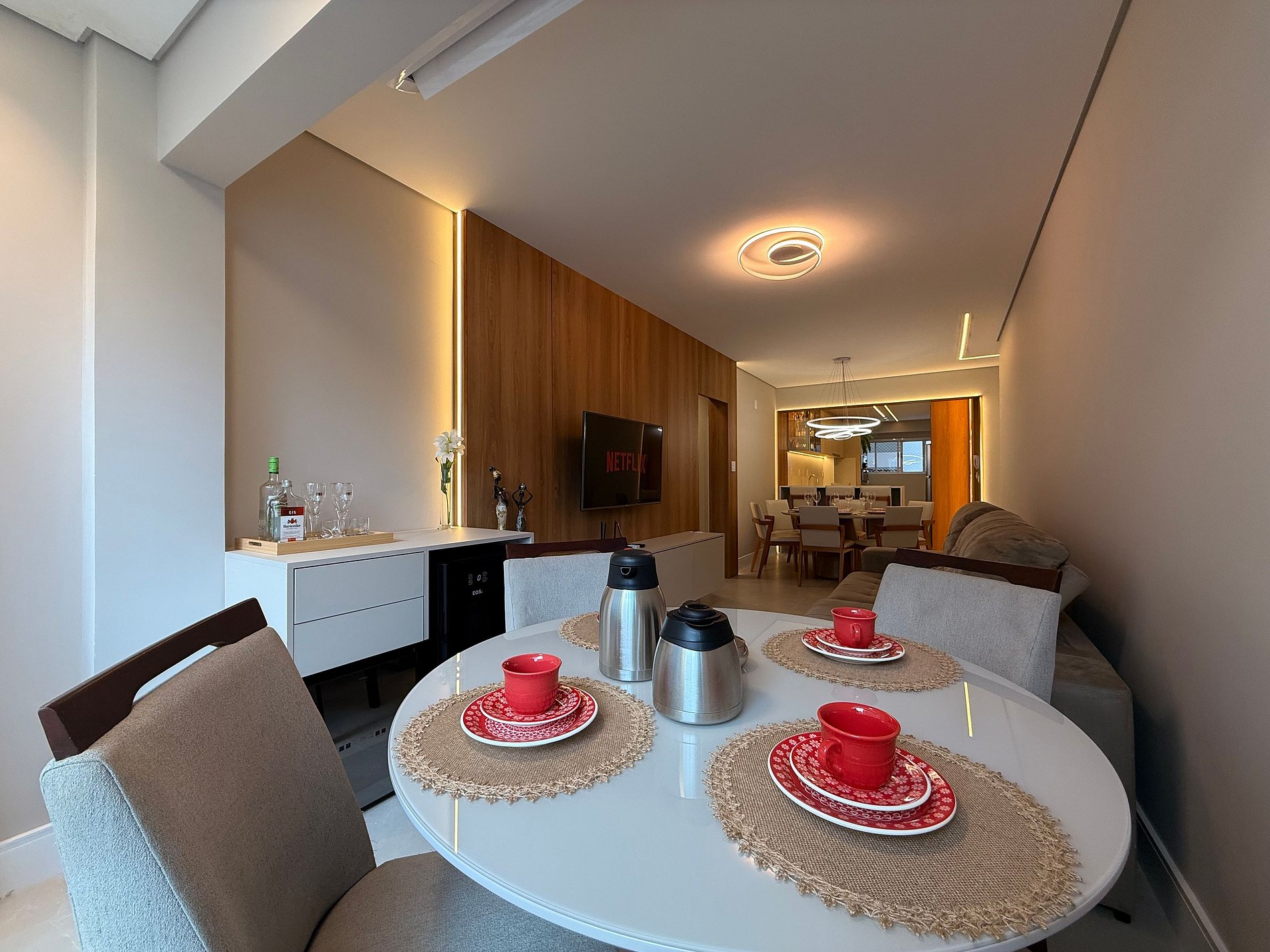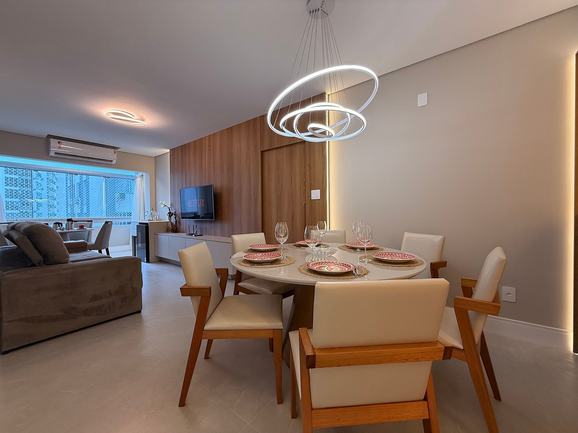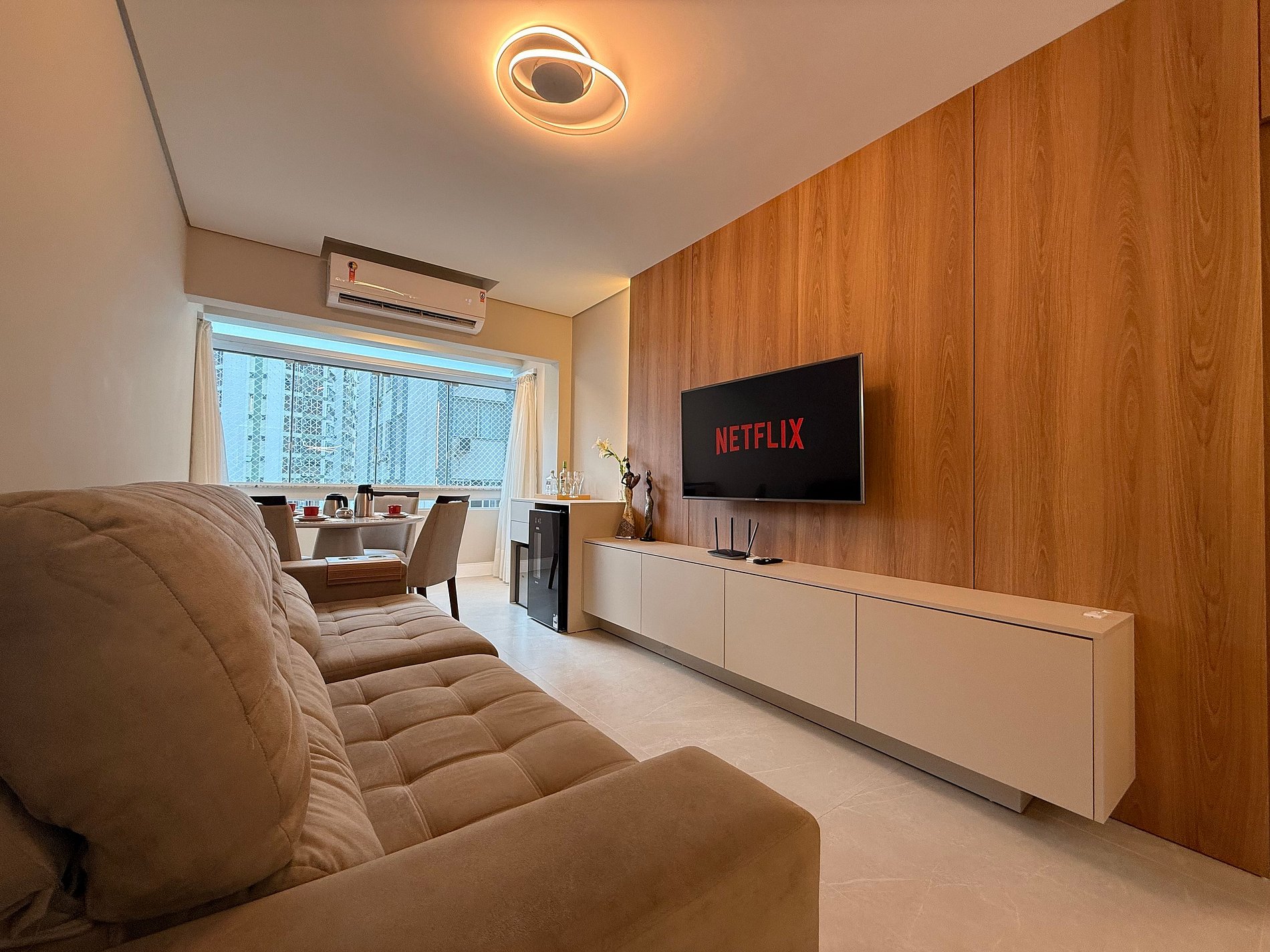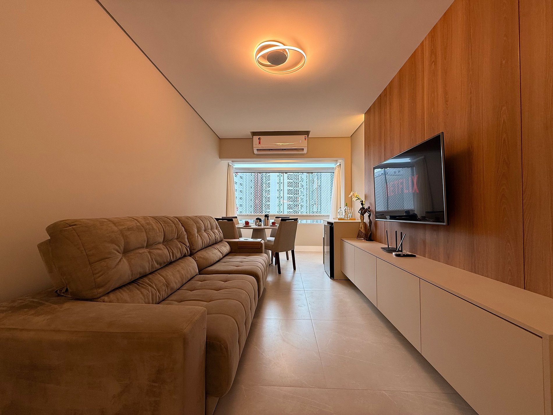 - Sala ampla e integrada com mesa de café 4 lugares e ar condicionado de 18 mil BTU