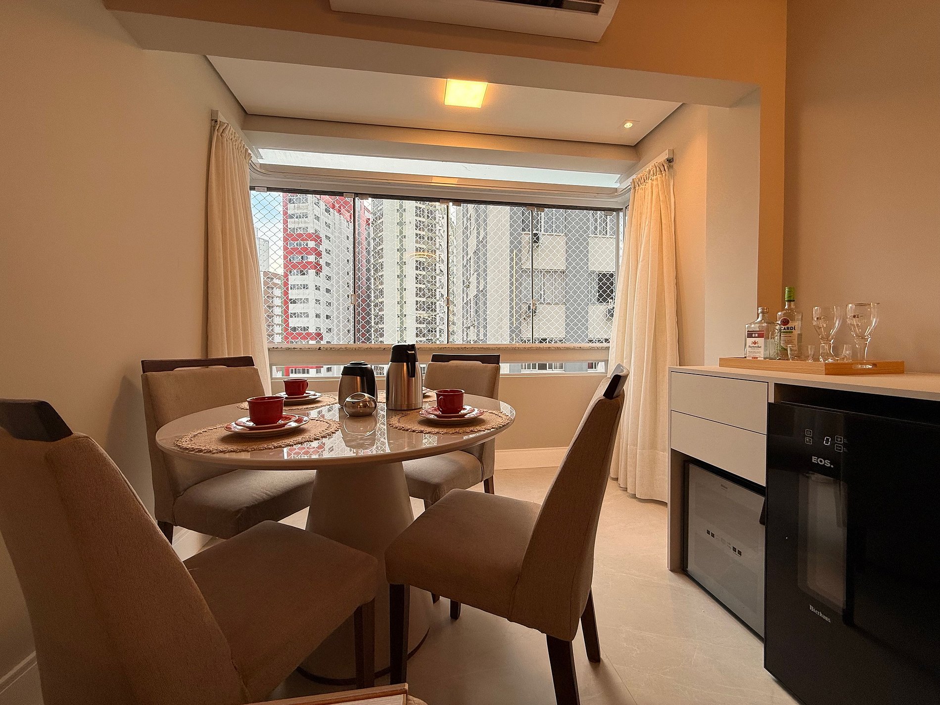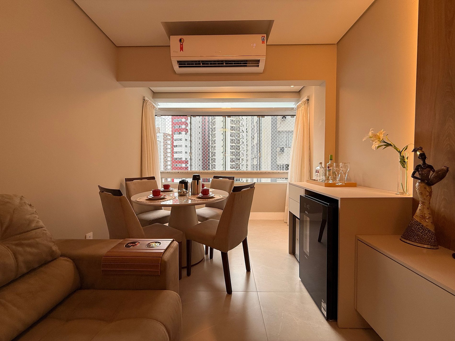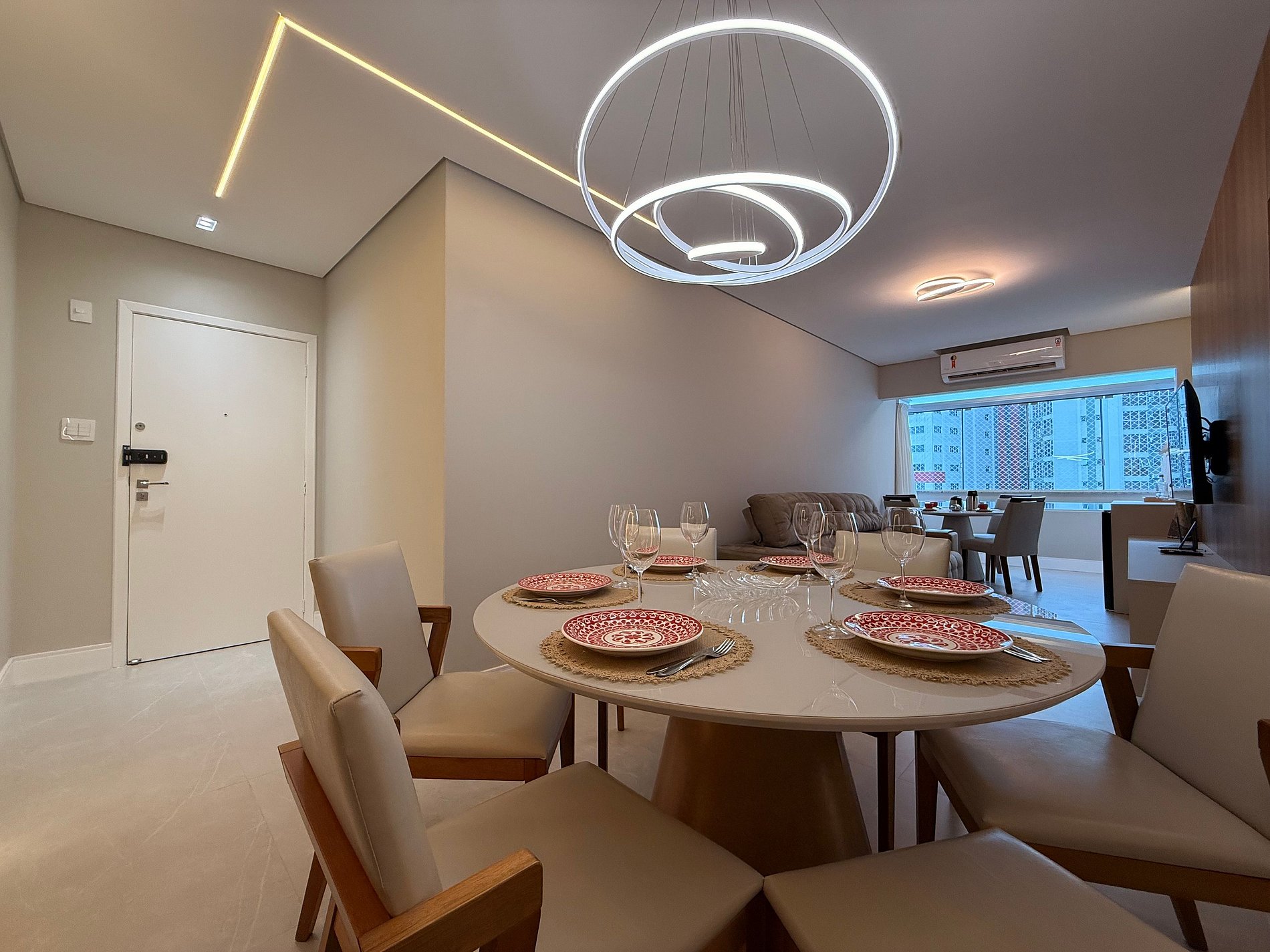- Sala ampla e integrada com mesa de café 4 lugares e ar condicionado de 18 mil BTU