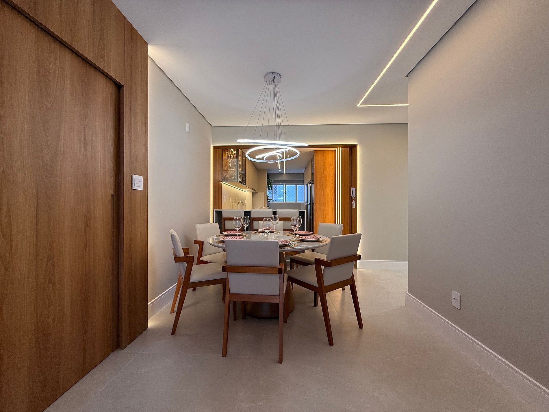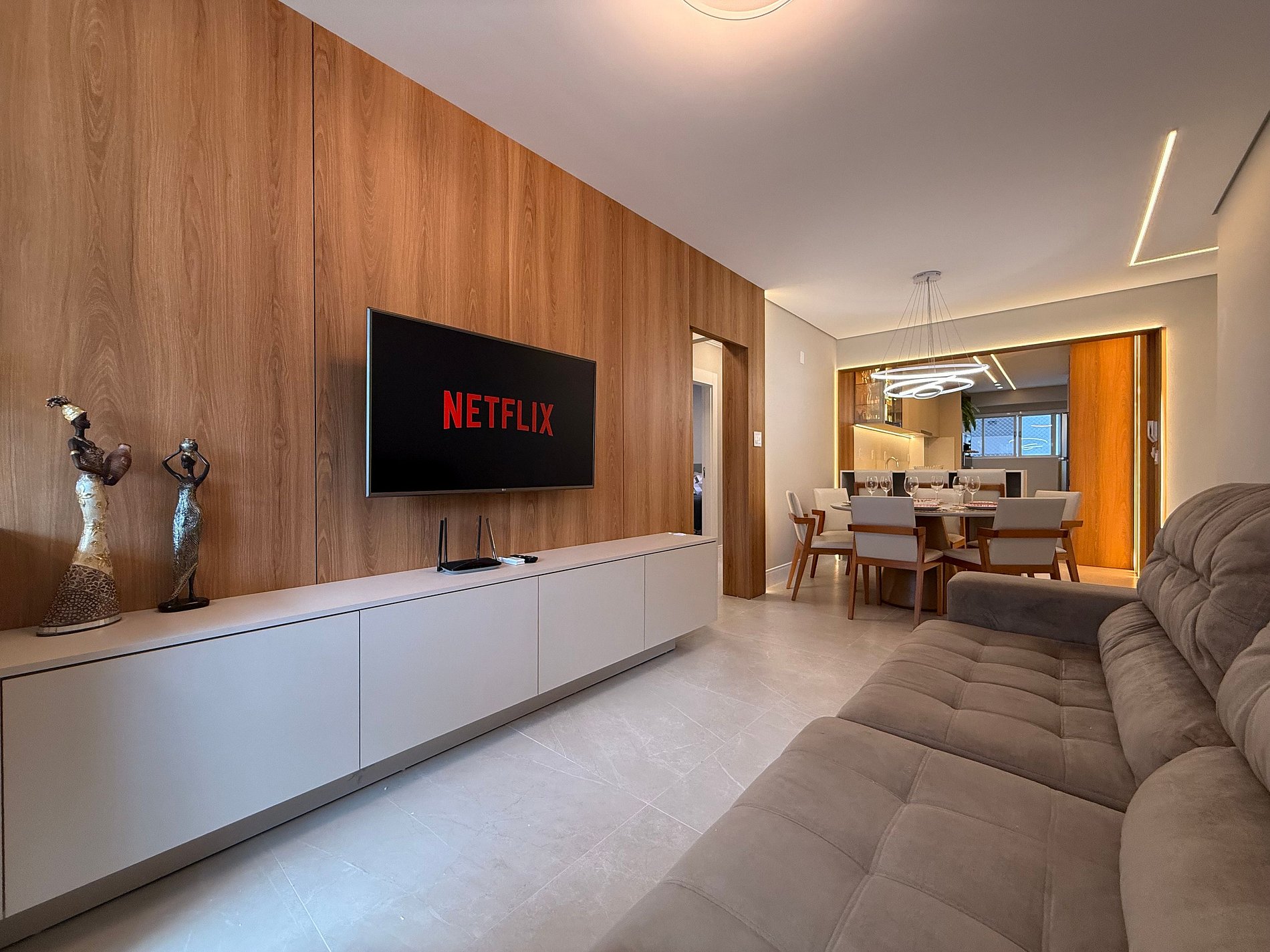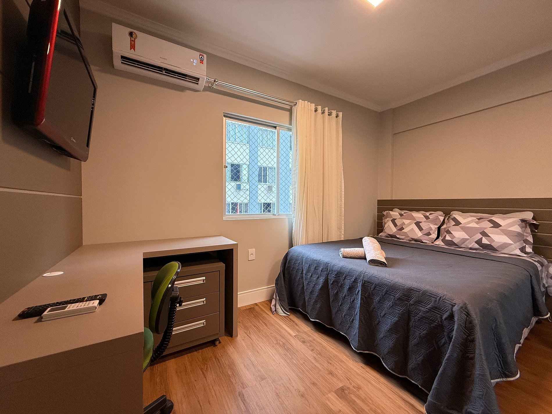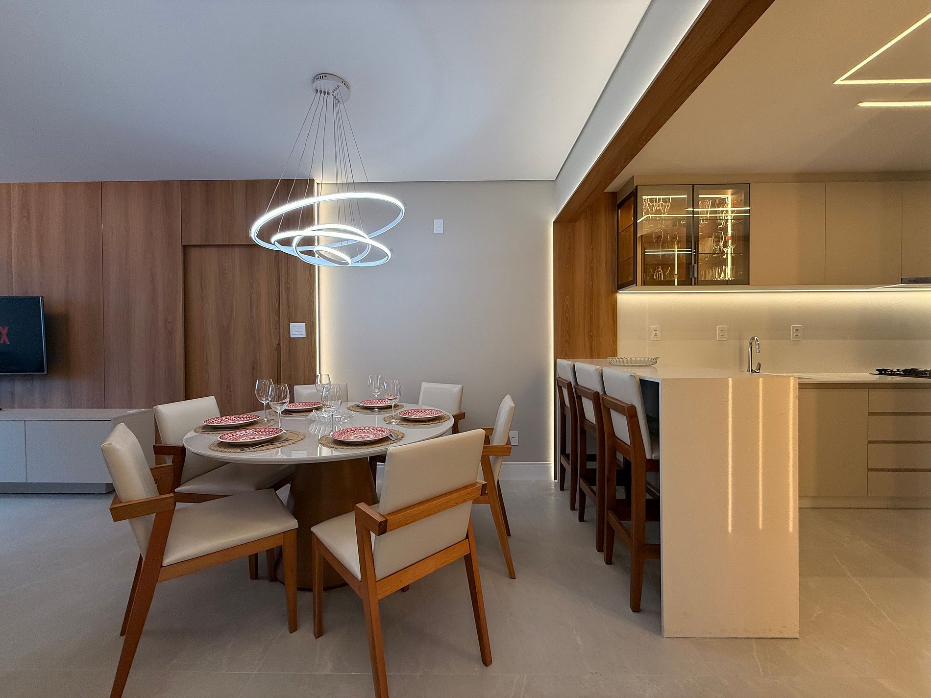 - Sala ampla e integrada com mesa de café 4 lugares e ar condicionado de 18 mil BTU