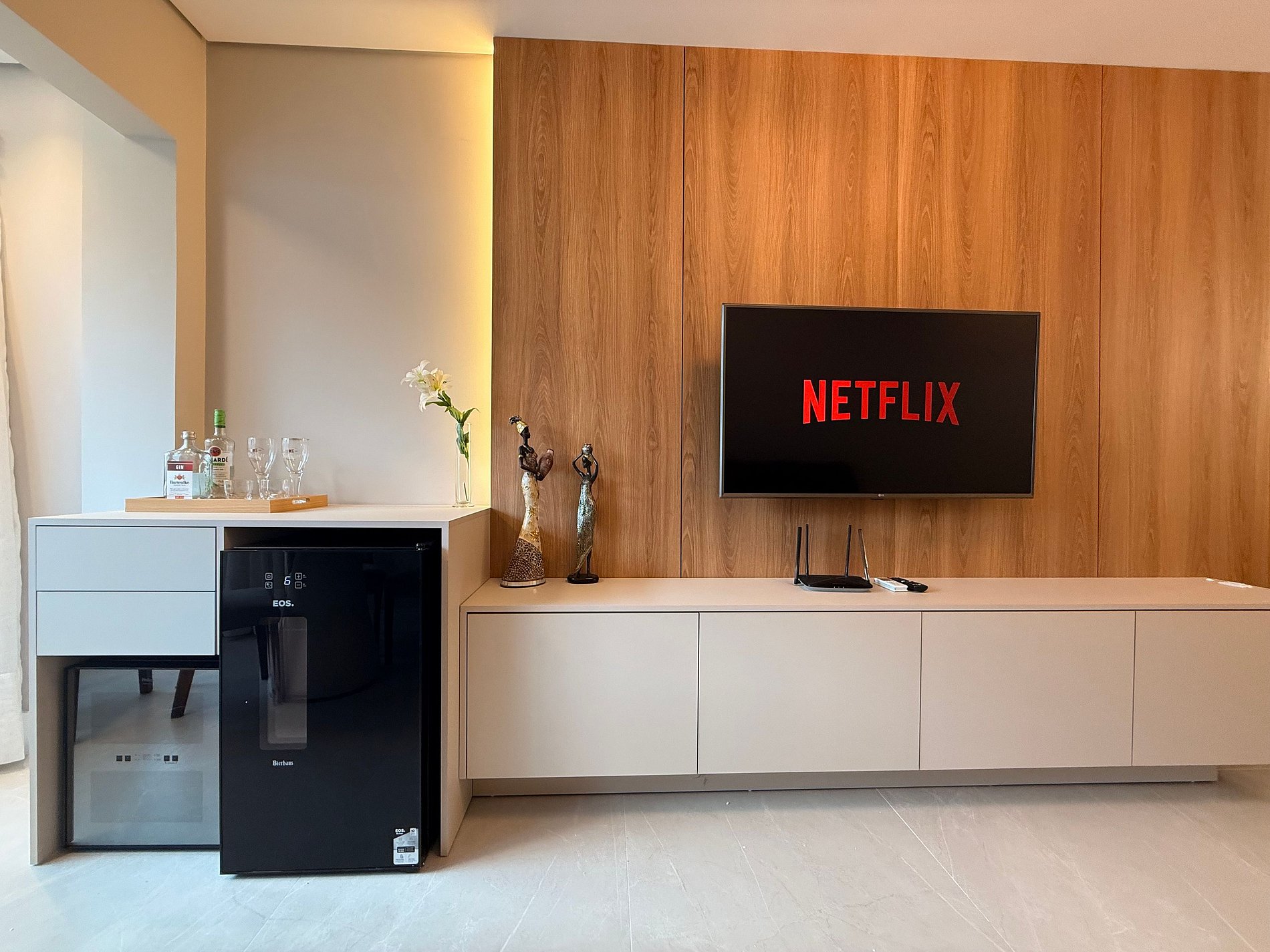- Sofá grande e confortável + TV Smart 47" polegadas com app como Netflix, Globoplay, Amazon Prime (necessário conectar com a conta própria)