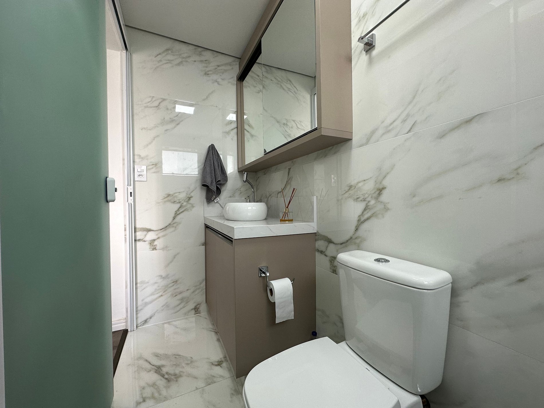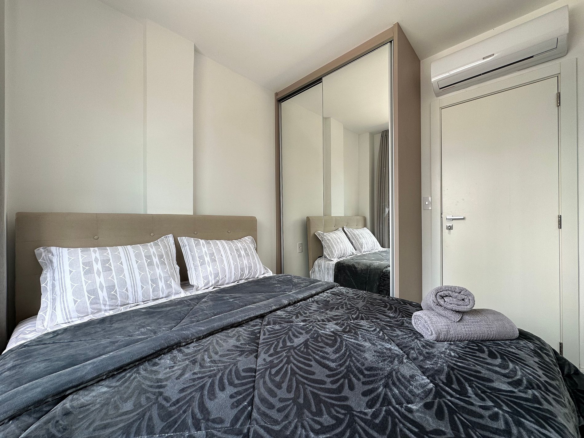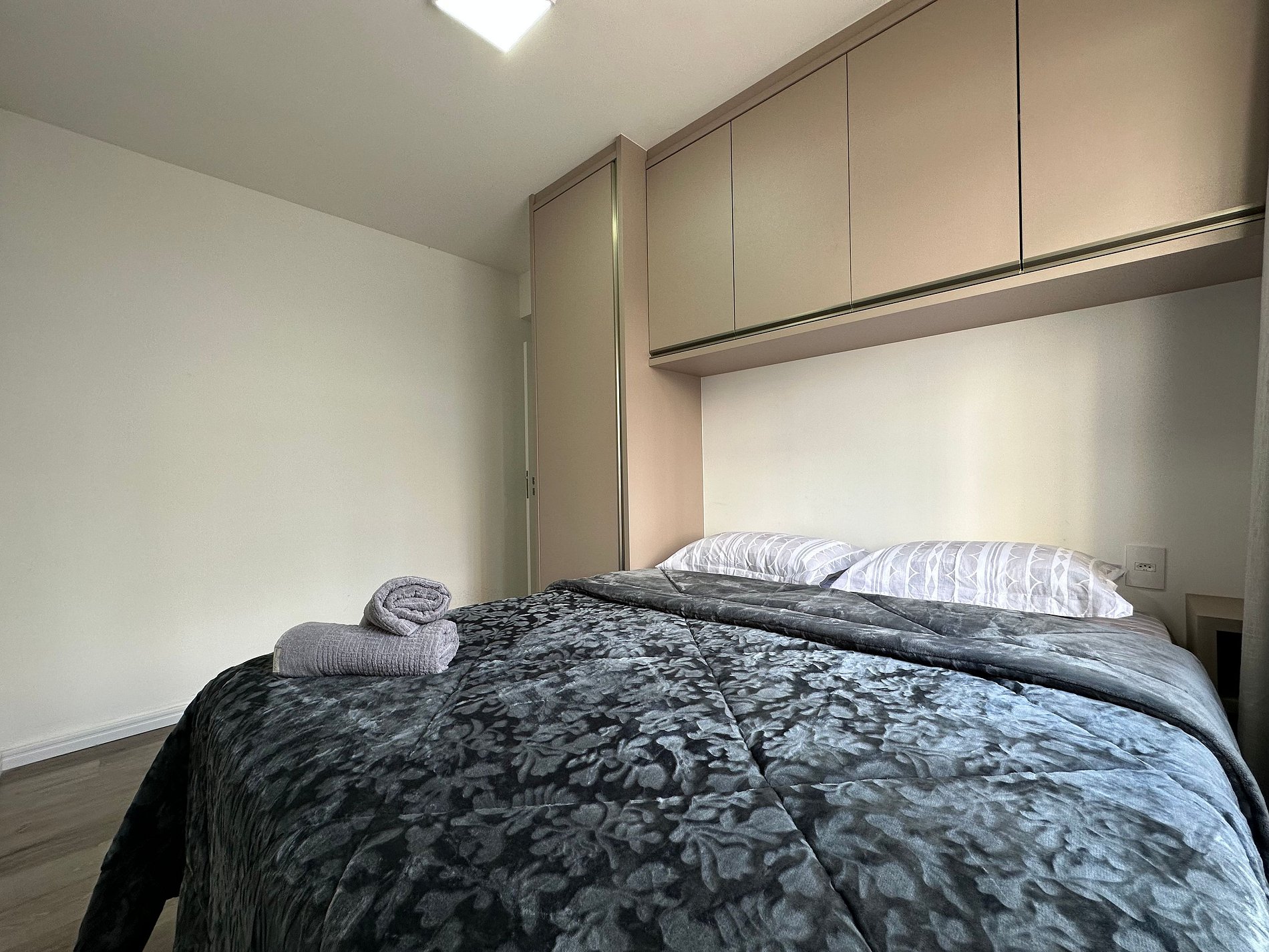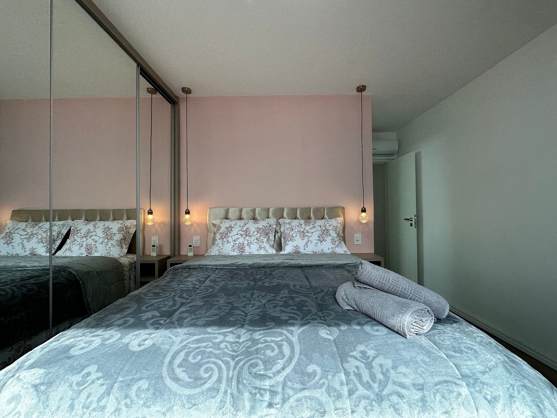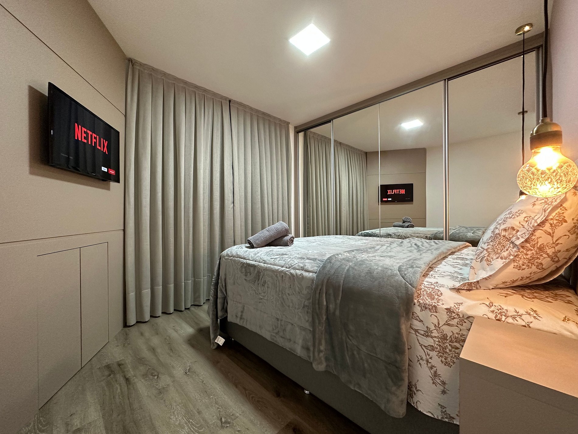 - Suíte 1: Suíte com cama box Queen Size, ar condicionado, guarda roupas grande, cortina blackout e TV Smart