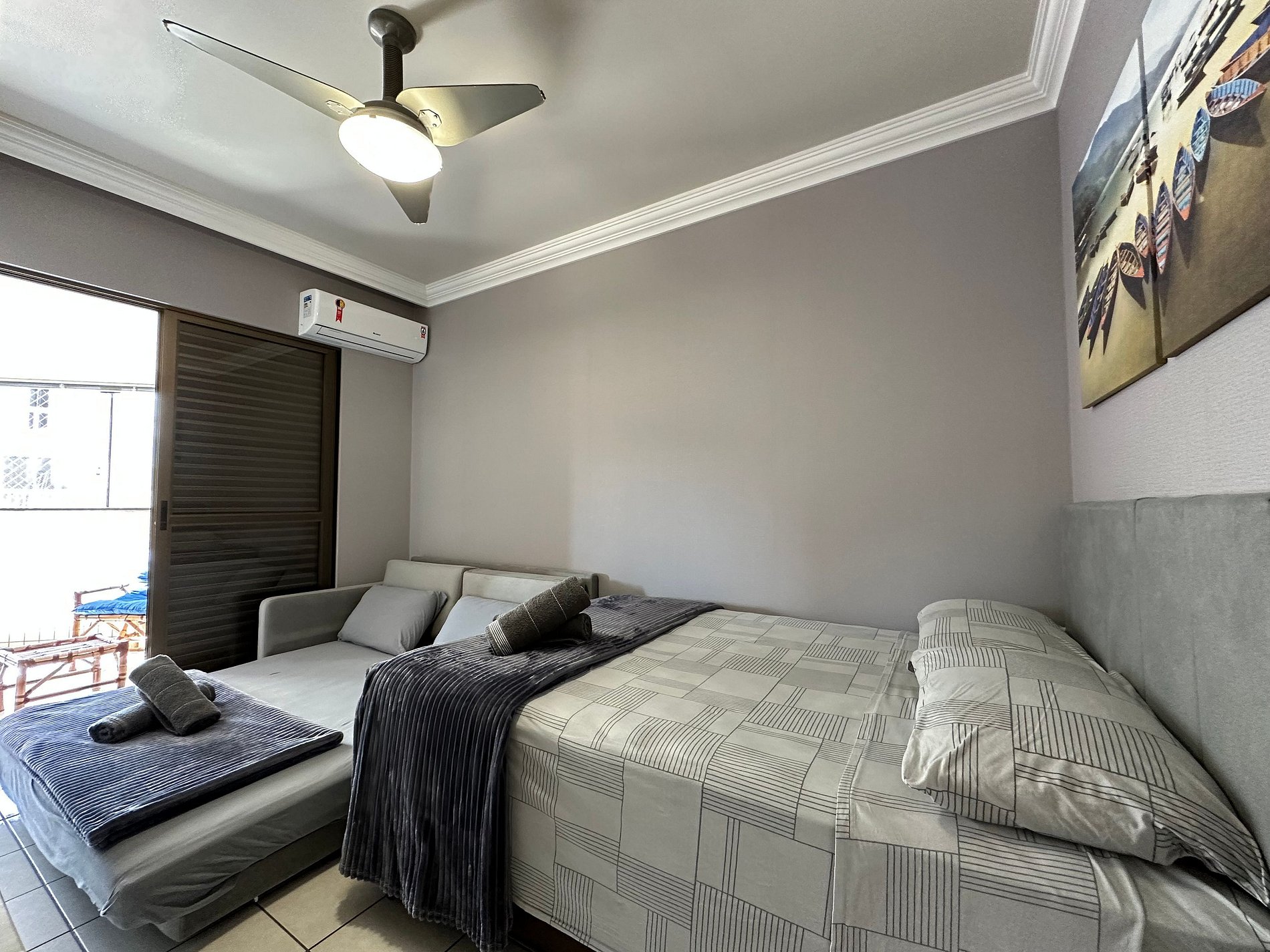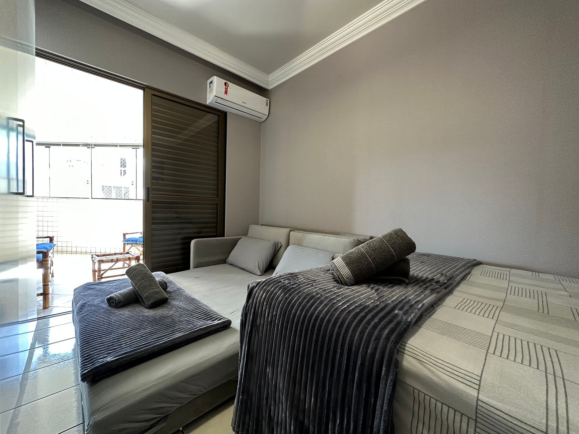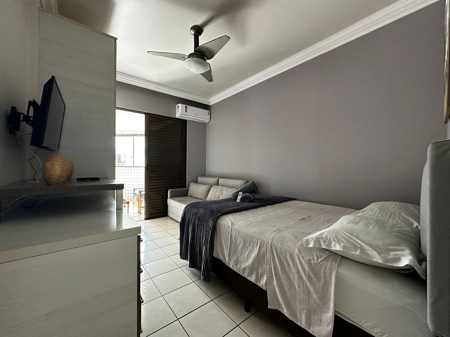 - QUARTO 2: Cama de Casal Box, Sofá Cama com colchão densidade D33 muito confortável, Ar Condicionado Split e Guarda Roupa