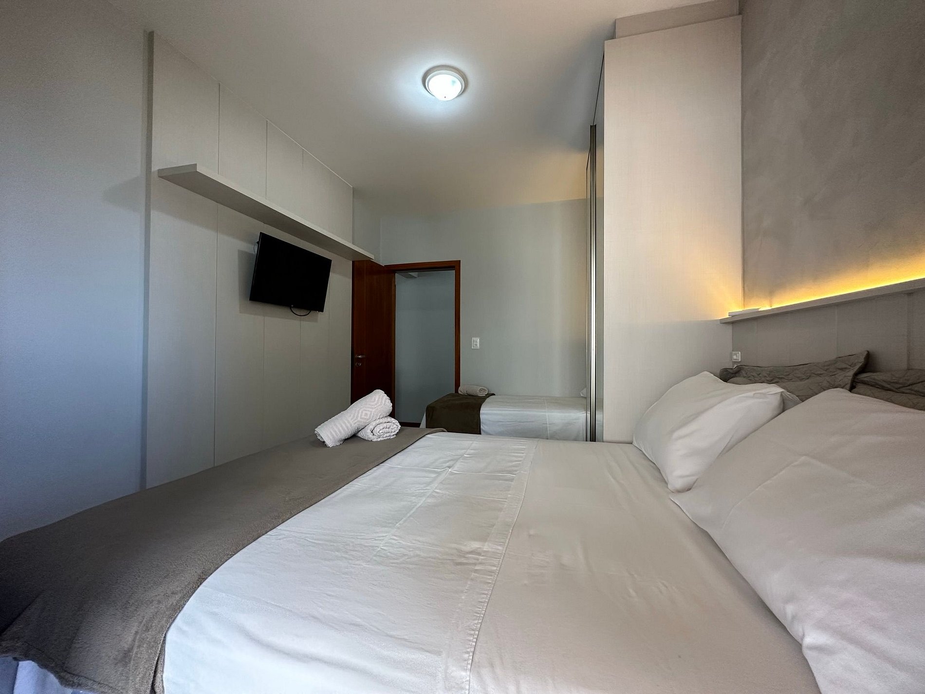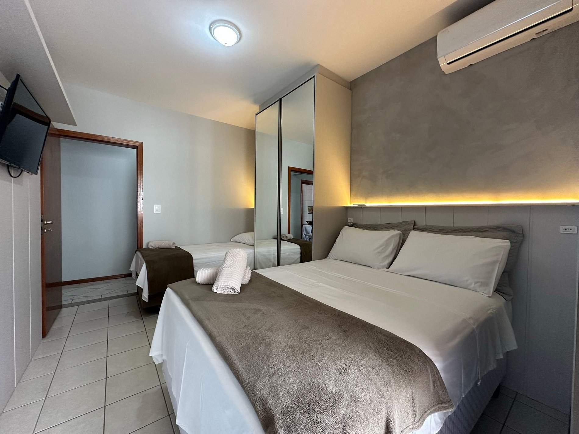 - QUARTO 2: Cama de casal box + cama solteiro box + guarda roupa porta espelho + TV somente smart (sem canais)