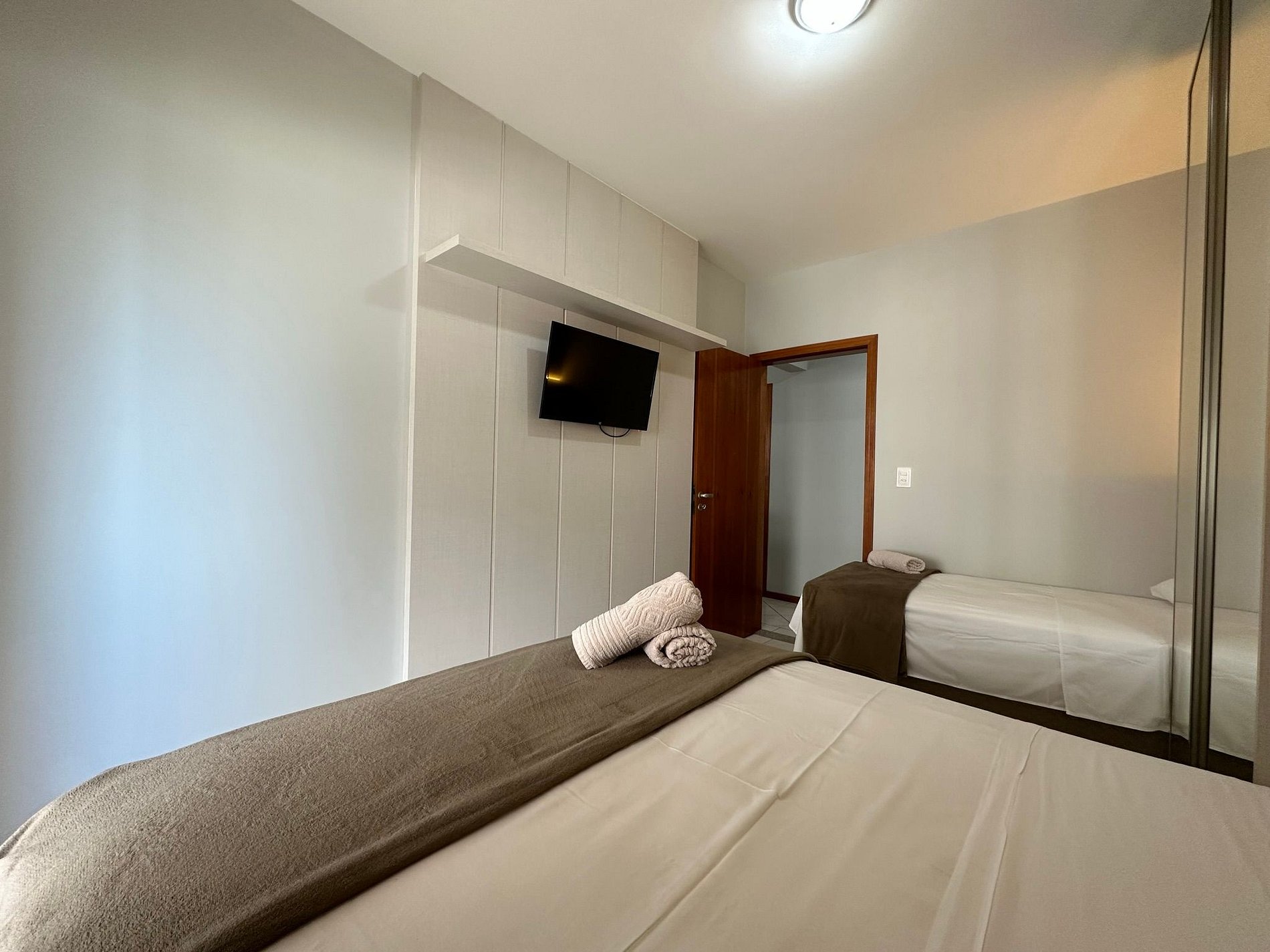 - QUARTO 2: Cama de casal box + cama solteiro box + guarda roupa porta espelho + TV somente smart (sem canais)