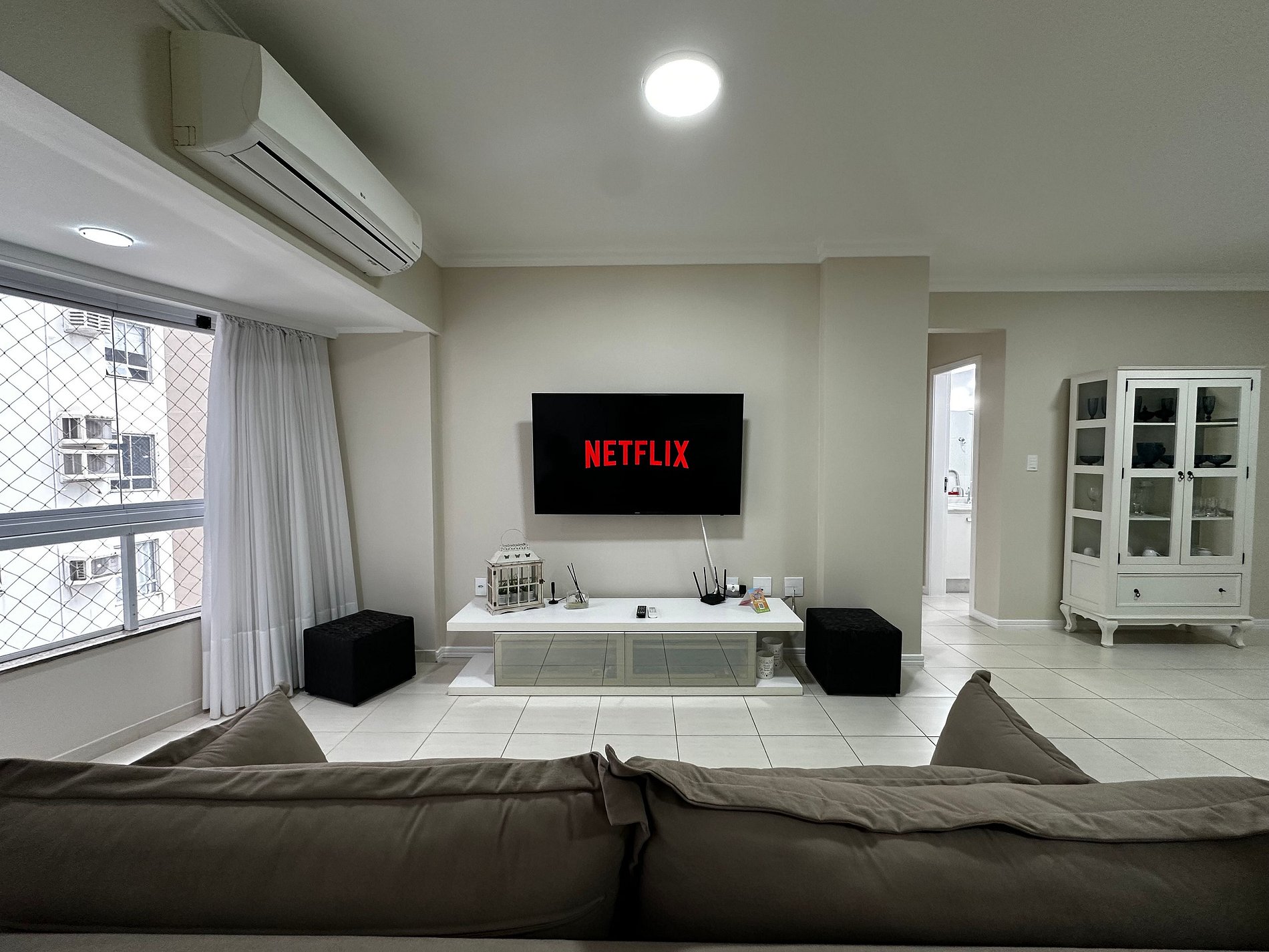 - Sala com sofá grande novo super confortável + TV Smart 47" polegadas com app como Netflix, Globoplay, Amazon Prime (necessário conectar com a conta própria)